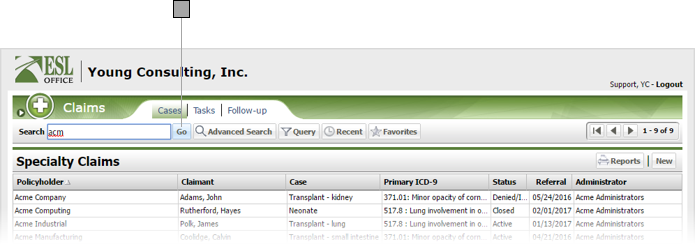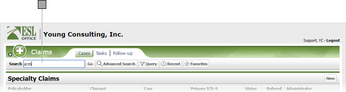 Enter some or all of the policyholder name in the Search field. Be aware that ESL Office searches for matches across the entire policyholder name, so entering "ins" in the search field will return both "insurance," and "reinsure."