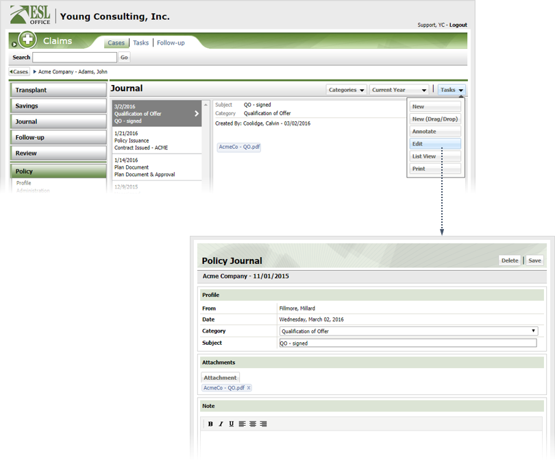 Click the journal you want to edit then click Tasks and choose Edit to display the Policy Journal window.