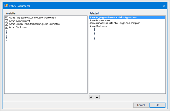 Check the box by each sub-document you want to assemble into your policy document. Checked items appear in the Selected area. Clear a check box to remove the sub-document. Documents assemble in the order they appear in the Selected area.