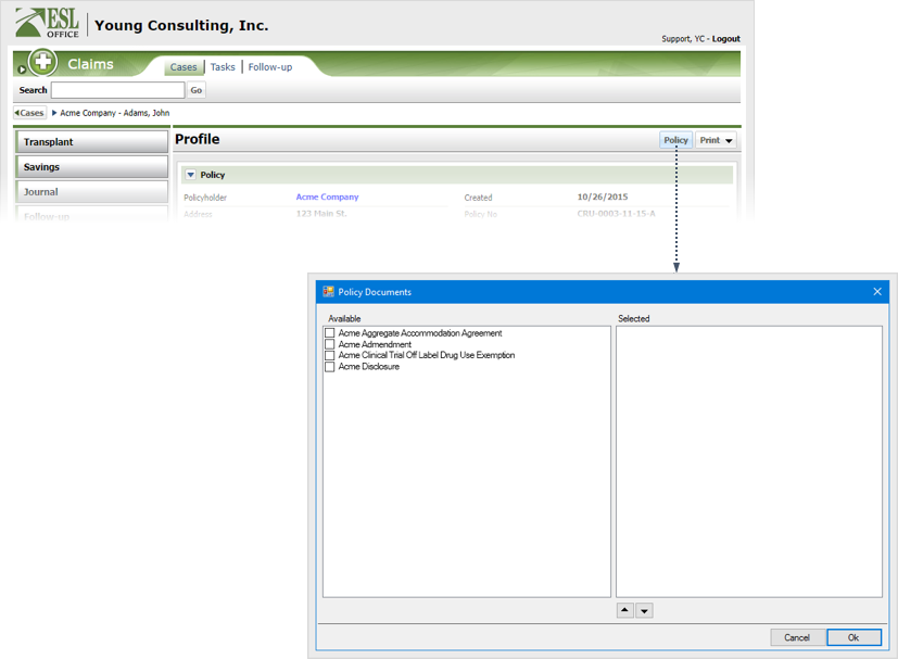 Click Policy. If this is the first time you have assembled and printed policy documents, ESL Office downloads and installs the policy plugin. Once the plugin installs, the Policy Documents window opens showing all the registered sub-documents for the policy. Policy sub-documents are registered by your ESL Office administrator.