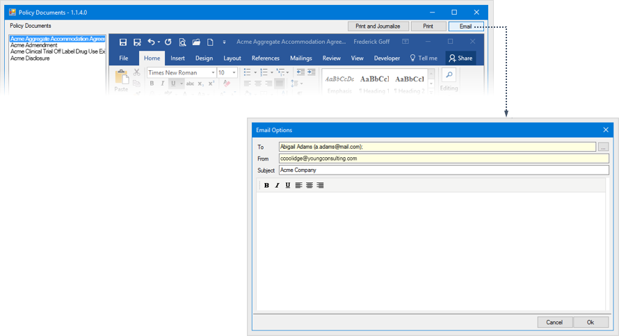To create an email with the assembled sub-documents as a PDF attachment, click Email. ESL Office displays the Email options window.